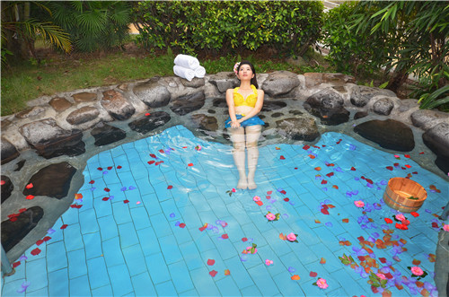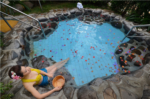 在露天溫泉區(qū),設(shè)有添加各種中菜肴的特色溫泉池。如芬芳一人、安神醒腦的香薰池;潤(rùn)滑凝脂、內(nèi)白肌膚的牛奶池;大補(bǔ)元?dú)?,生津安神的人參池以及米酒池、?dāng)歸池、金銀花池等。天然的溫泉水加上人工調(diào)配的特色藥材,能夠讓旅客有更多的選擇,達(dá)到保健養(yǎng)顏、強(qiáng)身健體的功效。同時(shí)還設(shè)有特色情趣魚(yú)療區(qū),通過(guò)小魚(yú)啄食肌膚,達(dá)到按摩、殺菌的功效。